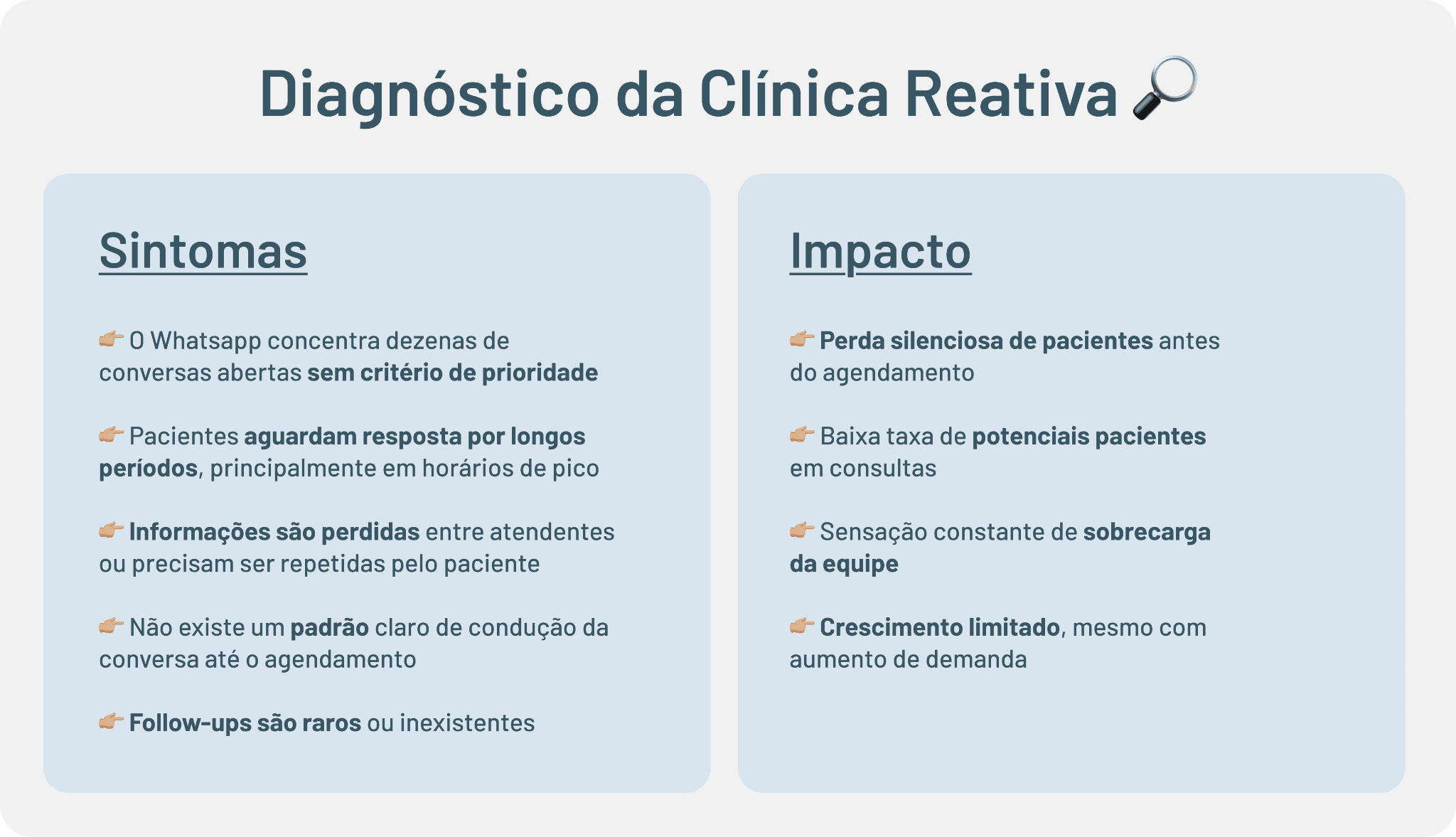 Isso cria um cenário onde: a clínica trabalha muito mas perde pacientes no processo
